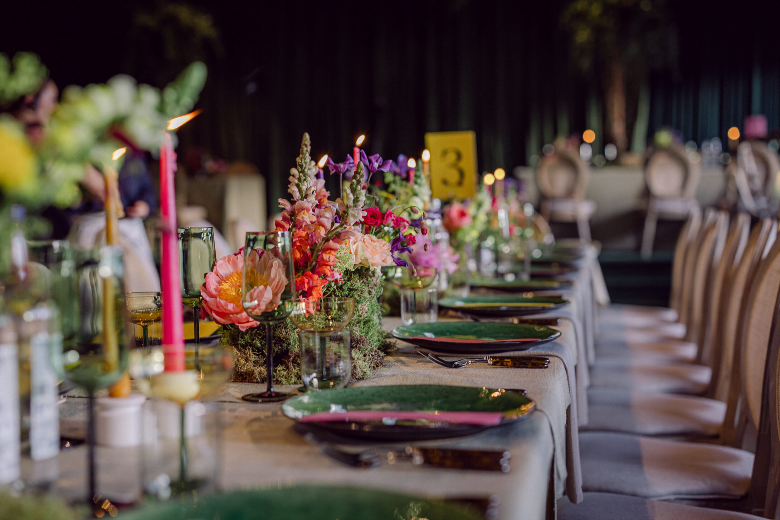 Personalisation can also go beyond monograms and guest names. A couple we worked with recently had a collection of poems selected for them by friends and family. We printed extracts on napkins used throughout the celebrations. You should also discuss together a rough design route you want to go down. It may be more pared back or maximalist, traditional or modern. You can then share these colours and keywords with your planner, florist, planner, or caterer. They will help you develop this into an overall look.